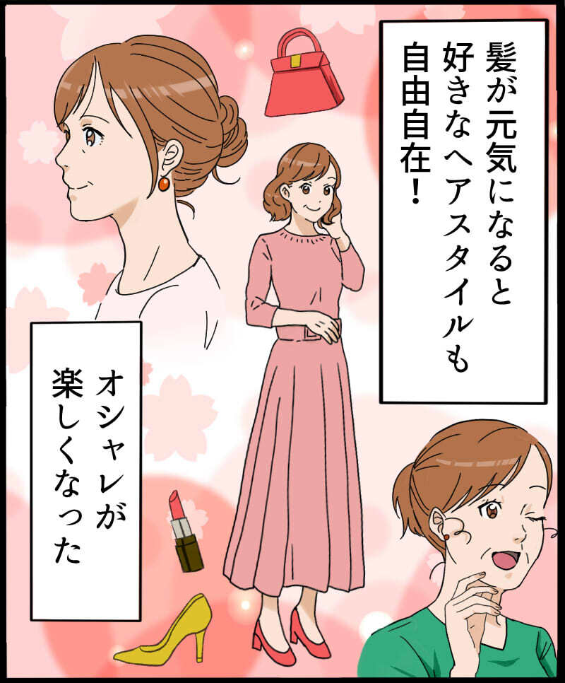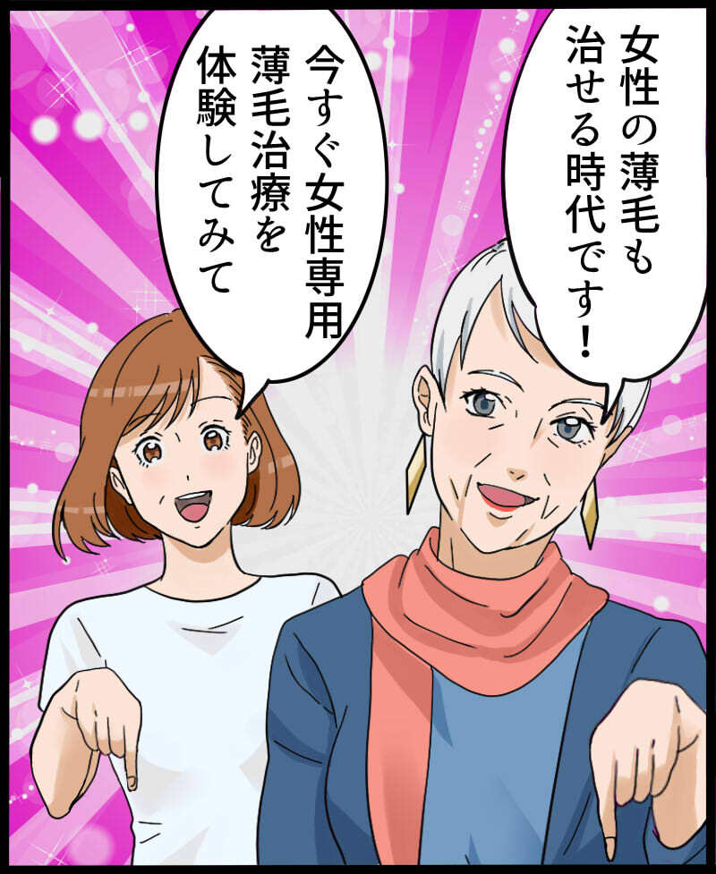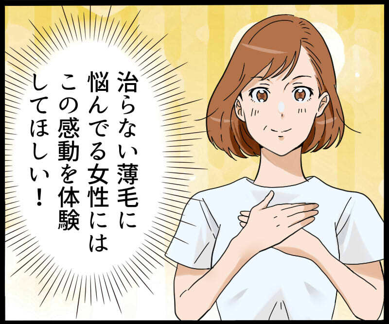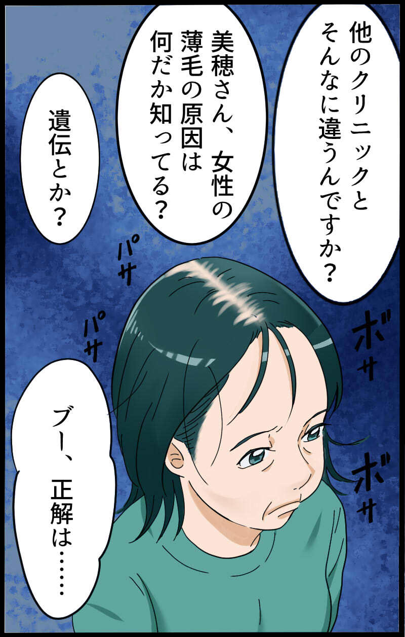 産後の抜け毛が止まらなくて、ずっと悩んでいました。「たかが薄毛で病院なんて大げさ」と最初は思ってましたが、お医者さんに丁寧に話を聞いてもらえるととても安心しますね!